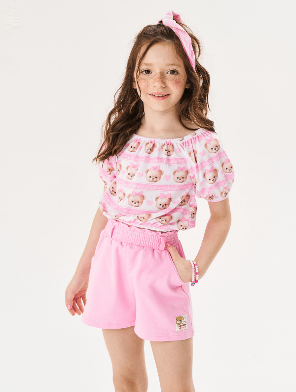 Conjunto vibrante e confortável de blusa em malha new stretch apresenta um charmoso elástico de ombro a ombro, que proporciona um ajuste seguro, além de detalhes nas mangas e barra. Com uma estampa alegre e divertida, esta peça é perfeita para criar looks cheios de estilo. O short de moletinho complementa o conjunto com um toque de elegância descontraída, destacando-se pelo detalhe de lenço estampado. Seu cós estilo clochard, com elástico e presilhas, garante conforto e um ajuste perfeito. Os bolsos frontais adicionam funcionalidade, enquanto uma etiqueta decorativa próxima à bainha acrescenta um toque final de charme.