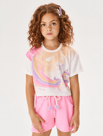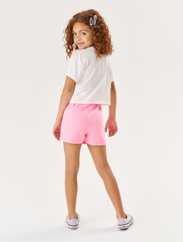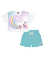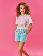 O conjunto perfeito para um visual divertido e confortável. A blusa cropped, feita em meia malha, apresenta uma estampa encantadora de unicórnio com detalhes em strass na parte frontal, adicionando um toque de brilho e magia ao look. O short, confeccionado em moletinho waffle, vem com um cós ajustável por elástico e cadarço, complementado por pompom para um detalhe lúdico. Os bolsos frontais são práticos e funcionais, e uma etiqueta decorativa próxima da bainha completa o visual com um charme adicional. Ideal para criar combinações cheias de estilo e personalidade, este conjunto é perfeito para momentos de diversão e passeios descontraídos. Primavera 24. A modelo veste tamanho 08 e possui 1,28 cm de altura.