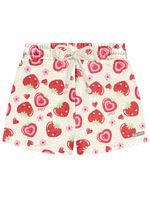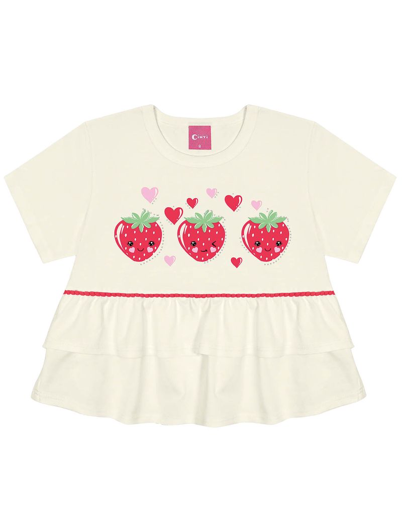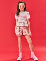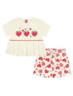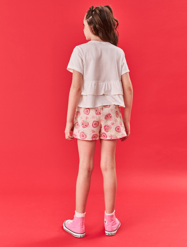 Conjunto de blusa em meia malha apresenta uma estampa frontal com strass, além de um delicioso cheirinho de morango que adiciona um toque especial. O recorte na cintura, decorado com pompom e babados, complementa o visual com um charme extra. O short em moletom linho oferece conforto com elástico e cadarço no cós, e possui uma estampa total de morangos que é um verdadeiro encanto. Uma etiqueta decorativa próxima da bainha do short completa o conjunto, destacando o cuidado com os detalhes. Ideal para criar looks divertidos e cheios de personalidade, garantindo conforto e estilo em todas as ocasiões. Primavera 24. A modelo veste tamanho 8 e possui 1,27 cm de altura.