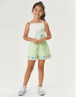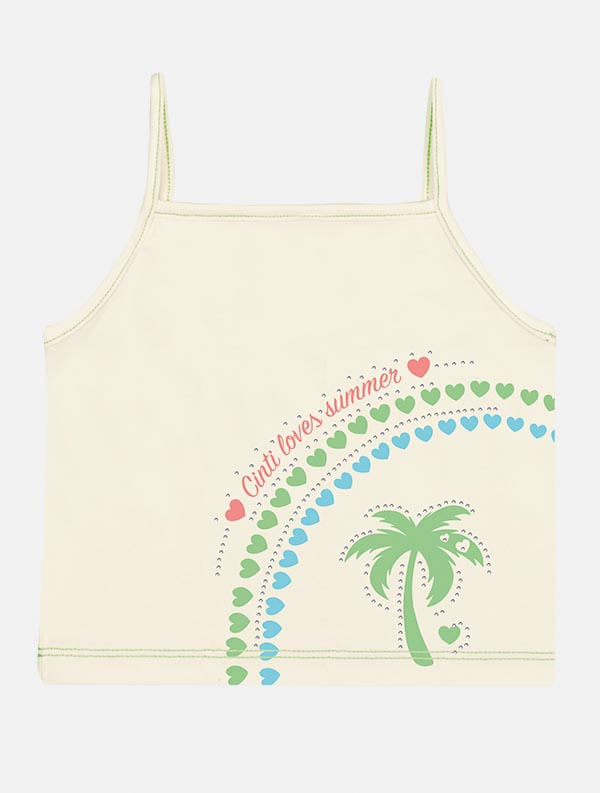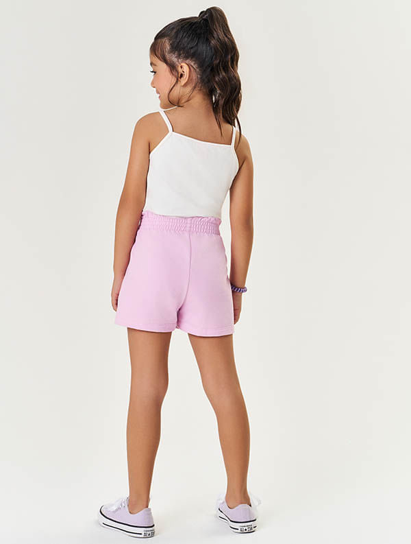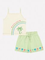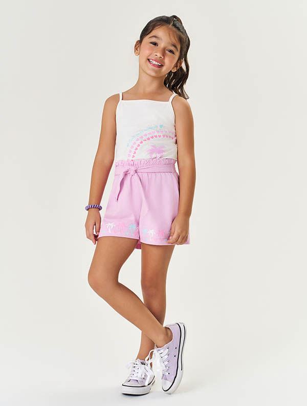 Conjunto com combinação perfeita de estilo e conforto para os pequenos. A blusa cropped em cotton é adornada com uma estampa vibrante e detalhes em strass, que adicionam um brilho especial. O short, confeccionado em molecotton jeans, destaca-se pelo cós estilo clochard com elástico e uma faixa para laço, proporcionando um ajuste elegante e ajustável. Para um toque final, o short possui uma estampa de coqueiro próxima da bainha, trazendo um visual divertido e descontraído. Ideal para criar looks modernos e confortáveis, este conjunto é perfeito para as aventuras diárias dos pequenos fashionistas. Alto Verão 2024/2025. A modelo veste tamanho 6 e possui 1,17cm de altura.
