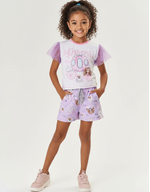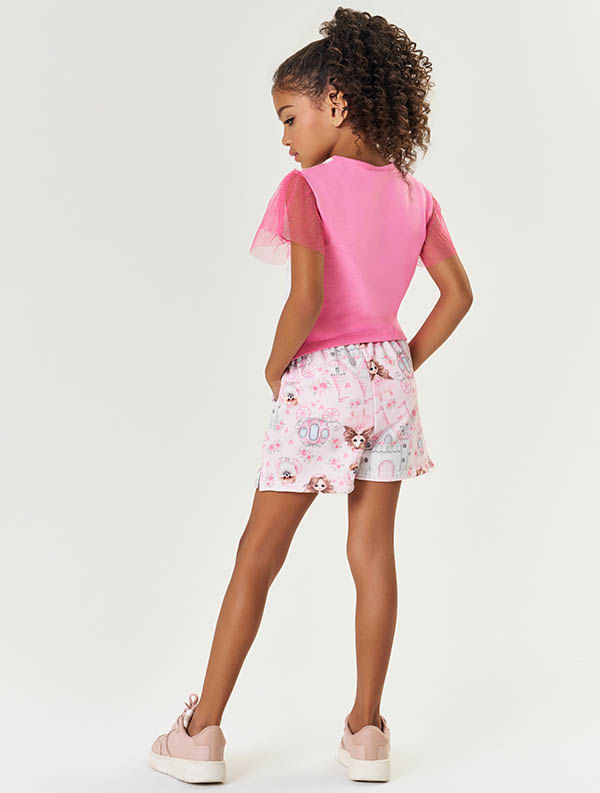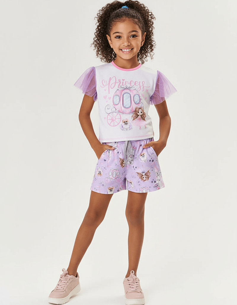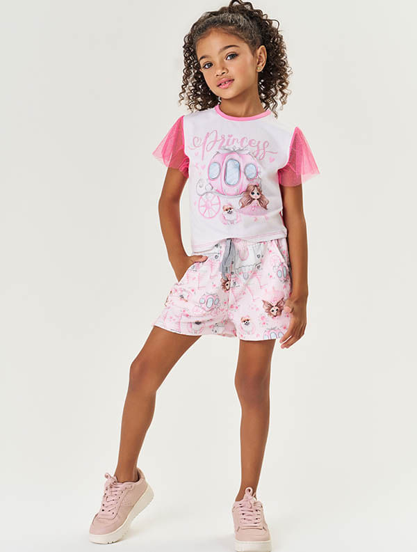 Este conjunto é a escolha ideal para quem busca um look moderno e cheio de estilo. A blusa boxy em cotton traz um toque especial com suas mangas em tule glitter, que adicionam um brilho encantador. A estampa frontal com strass oferece um detalhe sofisticado e glamouroso. O short, confeccionado em molecotton light, combina conforto e estilo, com um cós elástico e cadarço decorativo para um ajuste perfeito. Os bolsos frontais e a estampa total garantem um visual descolado, enquanto o detalhe de aberturas nas laterais e a etiqueta decorativa próxima da bainha completam o look com um toque de exclusividade. Ideal para qualquer ocasião, este conjunto proporciona uma combinação perfeita de elegância e diversão. Alto Verão 2024/2025. A modelo veste tamanho 6 e possui 1,20cm de altura.
