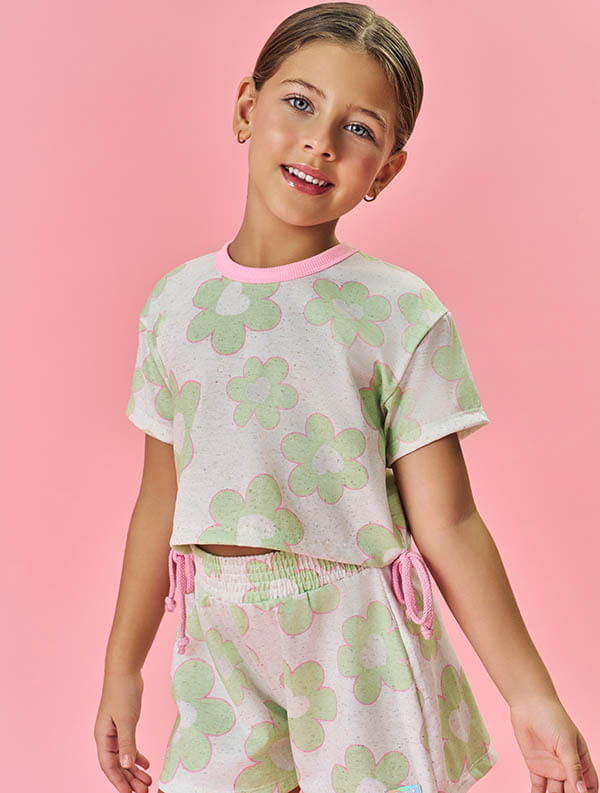 Conjunto perfeito para as pequenas que adoram um estilo floral e fresco! A blusa cropped em cotton linho apresenta uma estampa total de flores, com cadarço nas laterais para amarração, trazendo um toque divertido e personalizado ao visual. O short, também em cotton linho, conta com cós elástico para conforto e liberdade de movimento, além de uma estampa total floral que complementa perfeitamente a blusa. A etiqueta decorativa próxima à bainha adiciona um charme extra à peça. Ideal para dias de sol e passeios, este conjunto é uma escolha alegre e cheia de estilo! Alto Verão 2024/2025. A modelo veste tamanho 6 e possui 1,22cm de altura.