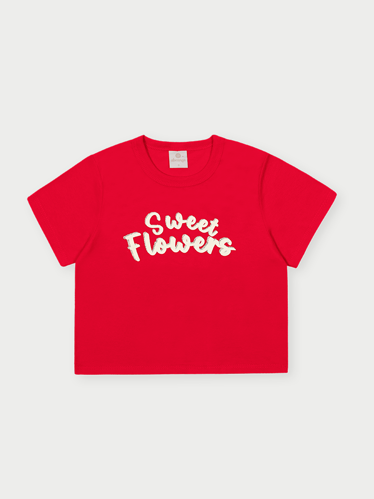 A blusa em meia malha possui modelagem boxy, com caimento solto, mais amplo e curtinho, proporcionando liberdade nos movimentos. O tecido tem toque macio e agradável, com excelente respirabilidade, perfeito para os dias quentes. O decote redondo com friso em ribana garante acabamento firme e confortável. A estampa frontal "Sweet Flowers" em lettering adiciona um toque fofo e divertido ao visual.