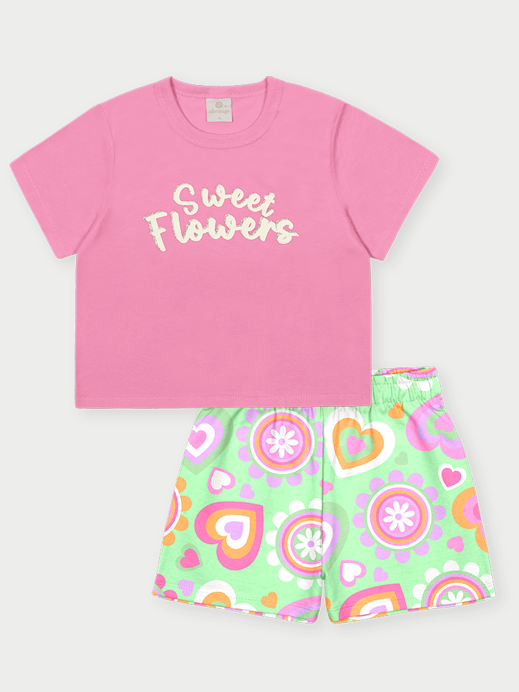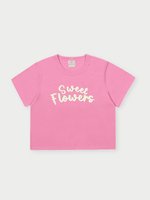 A blusa em meia malha possui modelagem boxy, com caimento solto, mais amplo e curtinho, proporcionando liberdade nos movimentos. O tecido tem toque macio e agradável, com excelente respirabilidade, perfeito para os dias quentes. O decote redondo com friso em ribana garante acabamento firme e confortável. A estampa frontal "Sweet Flowers" em lettering adiciona um toque fofo e divertido ao visual.