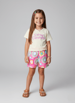 O short em moletinho light tem toque extremamente leve, macio e suave, oferecendo conforto o dia todo sem pesar ou aquecer demais. O elástico na cintura facilita o vestir e proporciona um ajuste confortável, enquanto a estampa floral em sublimação traz um ar delicado e encantador ao look, reforçando o tema floral de forma lúdica e moderna.