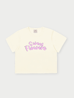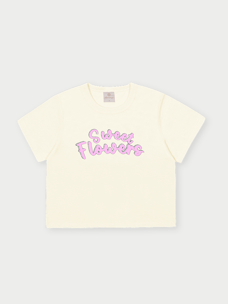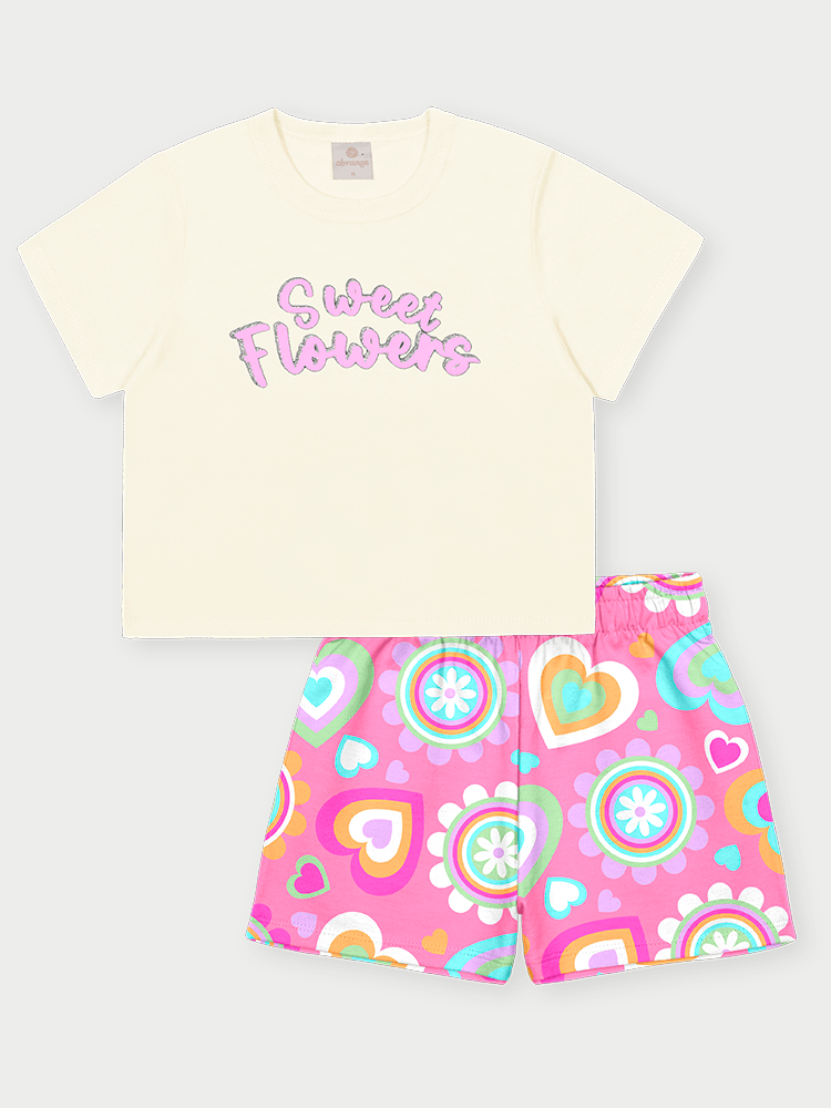 A blusa em meia malha possui modelagem boxy, com caimento solto, mais amplo e curtinho, proporcionando liberdade nos movimentos. O tecido tem toque macio e agradável, com excelente respirabilidade, perfeito para os dias quentes. O decote redondo com friso em ribana garante acabamento firme e confortável. A estampa frontal "Sweet Flowers" em lettering adiciona um toque fofo e divertido ao visual.