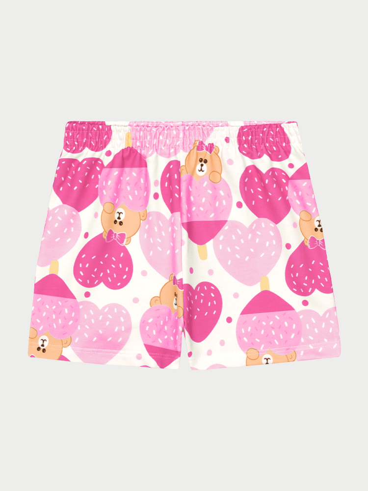 O short em molecotton light tem toque extremamente macio, levemente encorpado e com elasticidade suave, o que o torna perfeito para o conforto e a movimentação das crianças. O elástico na cintura se adapta ao corpo com leveza, e a estampa de ursinhos e corações em sublimação completa o visual de forma lúdica e fofa, mantendo as cores vivas por mais tempo.
