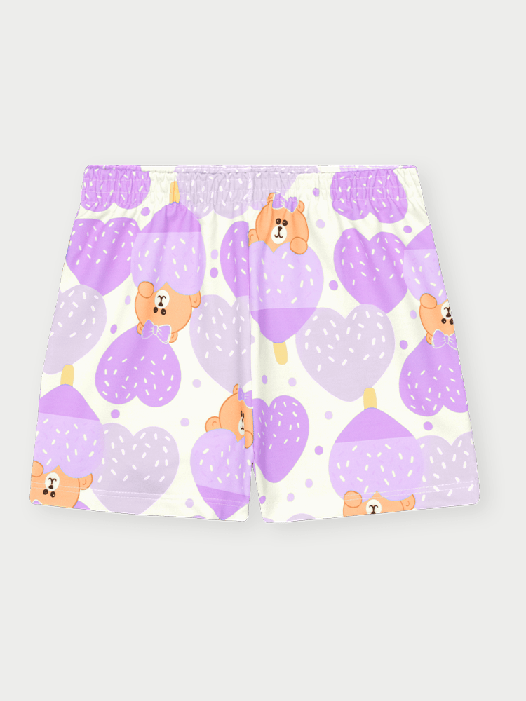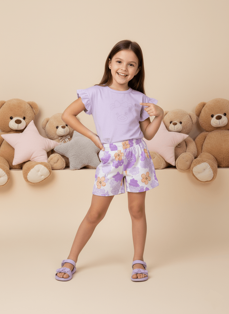 O short em molecotton light tem toque extremamente macio, levemente encorpado e com elasticidade suave, o que o torna perfeito para o conforto e a movimentação das crianças. O elástico na cintura se adapta ao corpo com leveza, e a estampa de ursinhos e corações em sublimação completa o visual de forma lúdica e fofa, mantendo as cores vivas por mais tempo.