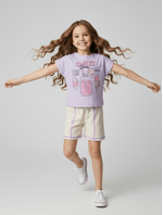 Este conjunto para menina, do tamanho 01 ao 08, une conforto e diversão com tecidos macios e um visual encantador para os dias mais quentes.