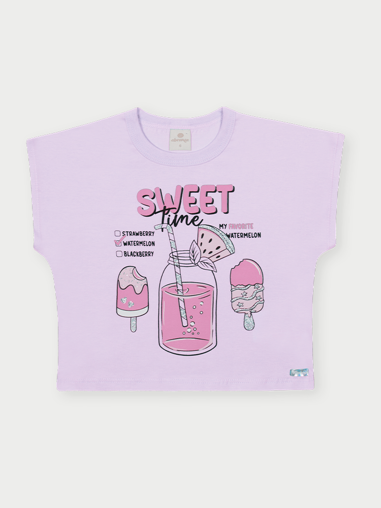 A blusa em meia malha possui toque leve, macio e agradável à pele, ideal para a rotina das pequenas. A modelagem boxy, mais soltinha e encurtada, proporciona liberdade de movimento e estilo descontraído. O decote redondo com friso em ribana oferece um acabamento confortável. A estampa de picolés e suco com glitter acrescenta um toque lúdico e brilhante, enquanto a etiqueta decorativa na barra traz um charme extra.