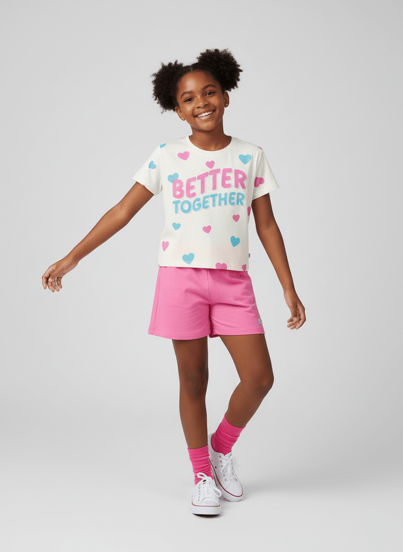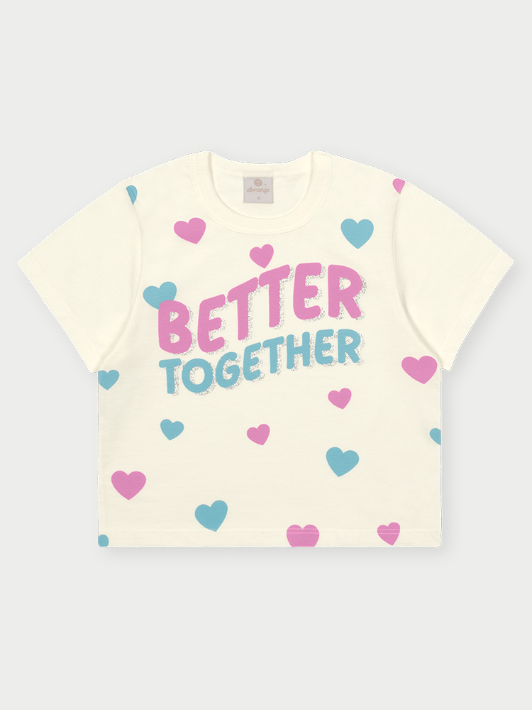 O modelo conta com blusa de modelagem soltinha e moderna, estampada com a frase “Better Together” em lettering divertido e rodeada de corações coloridos, que deixam o visual alegre e cheio de charme. O shorts possui cós com elástico embutido, proporcionando praticidade e liberdade para brincar com conforto o dia todo.