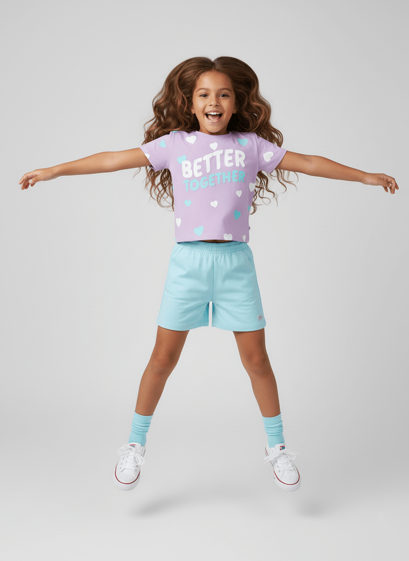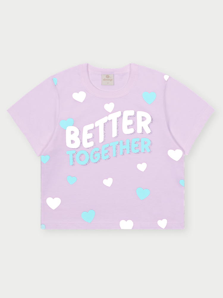 O modelo conta com blusa de modelagem soltinha e moderna, estampada com a frase “Better Together” em lettering divertido e rodeada de corações coloridos, que deixam o visual alegre e cheio de charme. O shorts possui cós com elástico embutido, proporcionando praticidade e liberdade para brincar com conforto o dia todo.