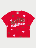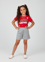 O modelo conta com blusa de modelagem soltinha e moderna, estampada com a frase “Better Together” em lettering divertido e rodeada de corações coloridos, que deixam o visual alegre e cheio de charme. O shorts possui cós com elástico embutido, proporcionando praticidade e liberdade para brincar com conforto o dia todo.