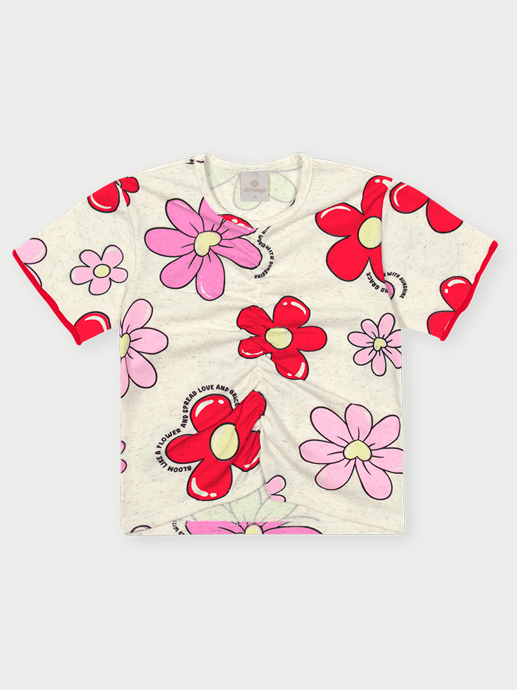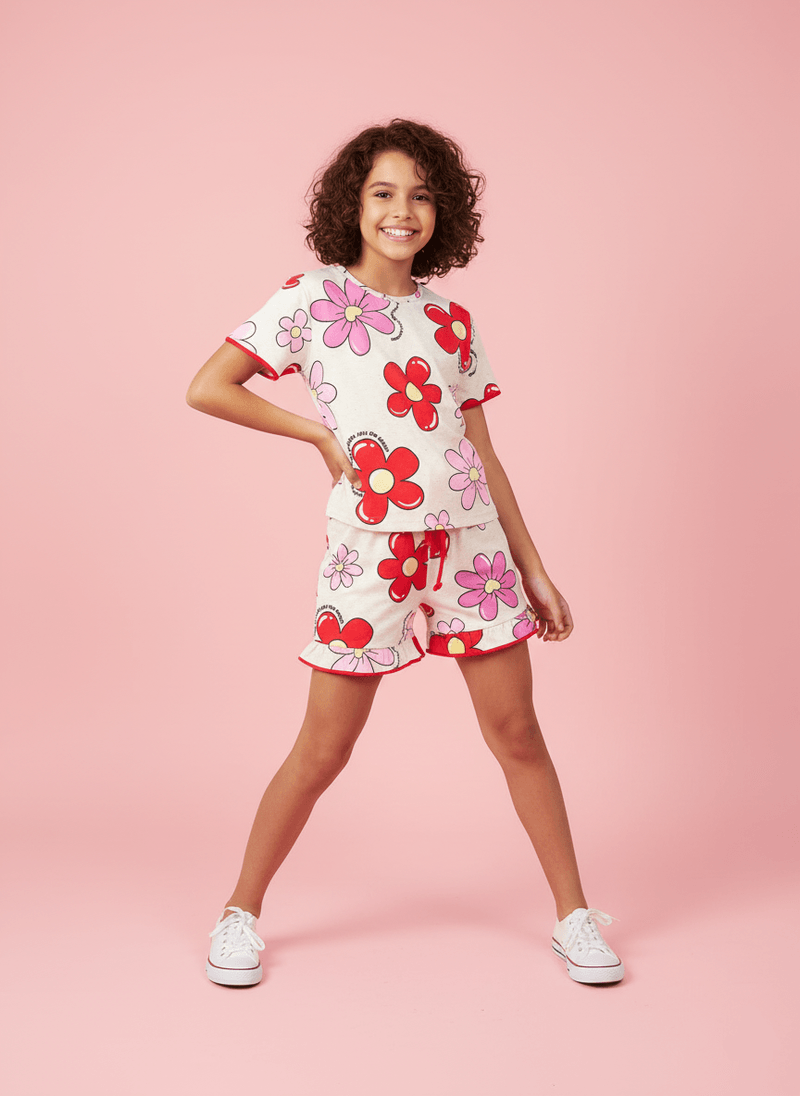 Deixe os dias da sua menina ainda mais alegres com este conjunto infantil de blusa e shorts estampados com flores coloridas. Desenvolvido em tecido de alta qualidade, é a escolha perfeita para unir conforto e estilo em todas as ocasiões.