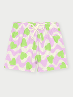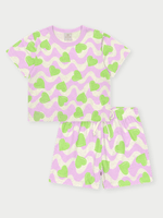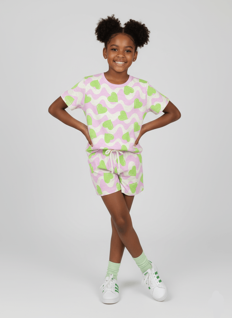 O diferencial do conjunto está na estampa divertida e cheia de personalidade: corações coloridos sobre um fundo em efeito ondulado, que traz modernidade e um ar lúdico à peça. Disponível em diferentes combinações de cores, é uma opção alegre e versátil para acompanhar as crianças em momentos de lazer, passeios ou encontros em família.