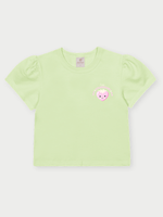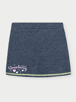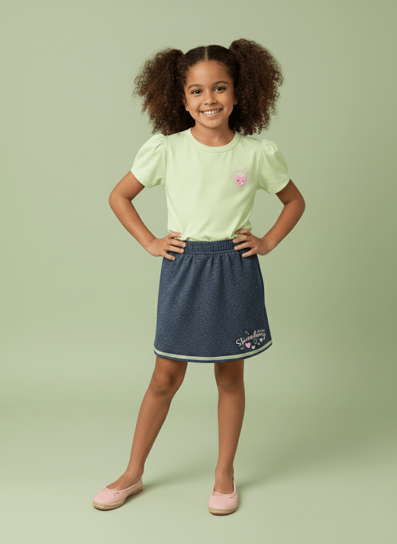 O design traz estampa delicada de moranguinho e lettering divertido, que adicionam charme e um ar lúdico ao look. A combinação da blusa colorida com a saia em tom jeans é moderna e versátil, ideal para diversas ocasiões, como passeios, festas informais e momentos de lazer.