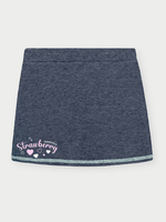 O design traz estampa delicada de moranguinho e lettering divertido, que adicionam charme e um ar lúdico ao look. A combinação da blusa colorida com a saia em tom jeans é moderna e versátil, ideal para diversas ocasiões, como passeios, festas informais e momentos de lazer.