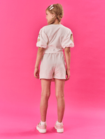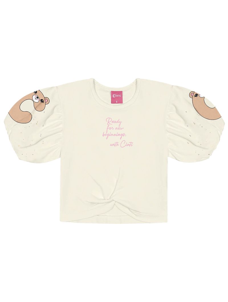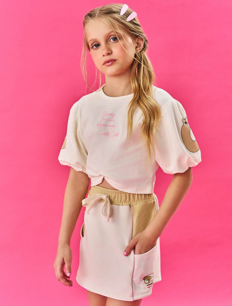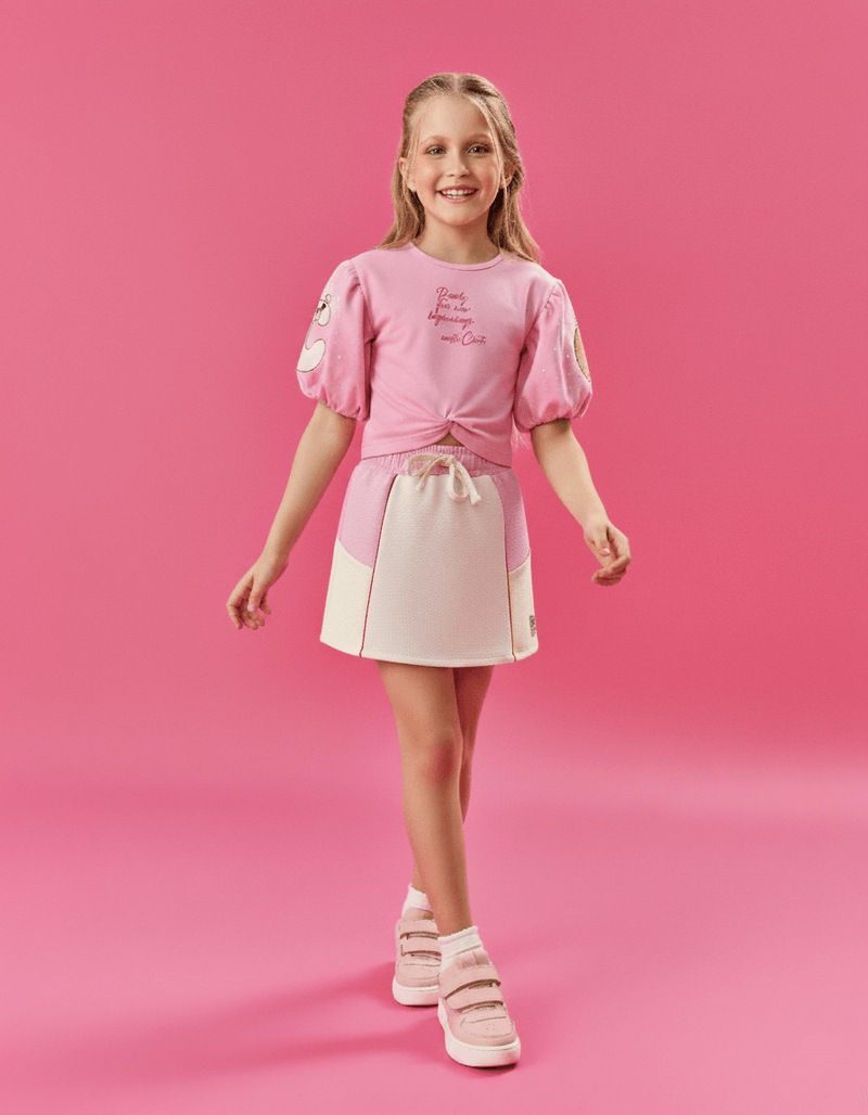 Conjunto cheio de estilo para as pequenas fashionistas! A blusa cropped em cotton apresenta mangas balonê que adicionam um toque de delicadeza, além de uma estampa divertida no peito e nas mangas, adornadas com strass para um brilho especial. O detalhe de torção frontal na cintura completa o visual, criando um look moderno e charmoso. O short-saia em moletinho é uma combinação perfeita de conforto e elegância. Com elástico e cadarço no cós para um ajuste seguro, possui recortes frontais contrastantes que destacam o estilo único da peça. Bolsos práticos adicionam funcionalidade, enquanto uma etiqueta decorativa próxima da bainha acrescenta um toque final de sofisticação.