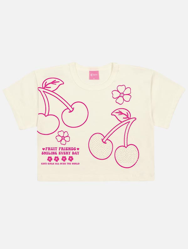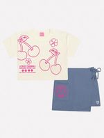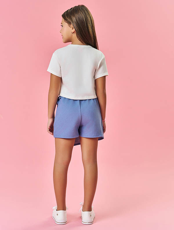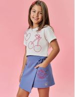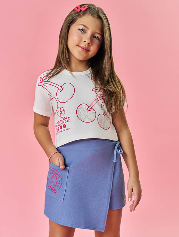 Conjunto perfeito para as pequenas que adoram estilo e conforto! A blusa cropped em meia malha apresenta uma estampa divertida com cheirinho de tutti-frutti e detalhes em strass na parte frontal, trazendo um brilho especial ao look. O short-saia em molecotton denim oferece um ajuste confortável com cós elástico e uma saia sobreposta que se amarra na lateral em um lindo laço. Com bolso lateral estampado e uma etiqueta decorativa próxima à bainha, este conjunto é ideal para brincadeiras e passeios. Uma escolha irresistível para compor looks cheios de charme e personalidade! Alto Verão 2024/2025. A modelo veste tamanho 6 e possui 1,22cm de altura.