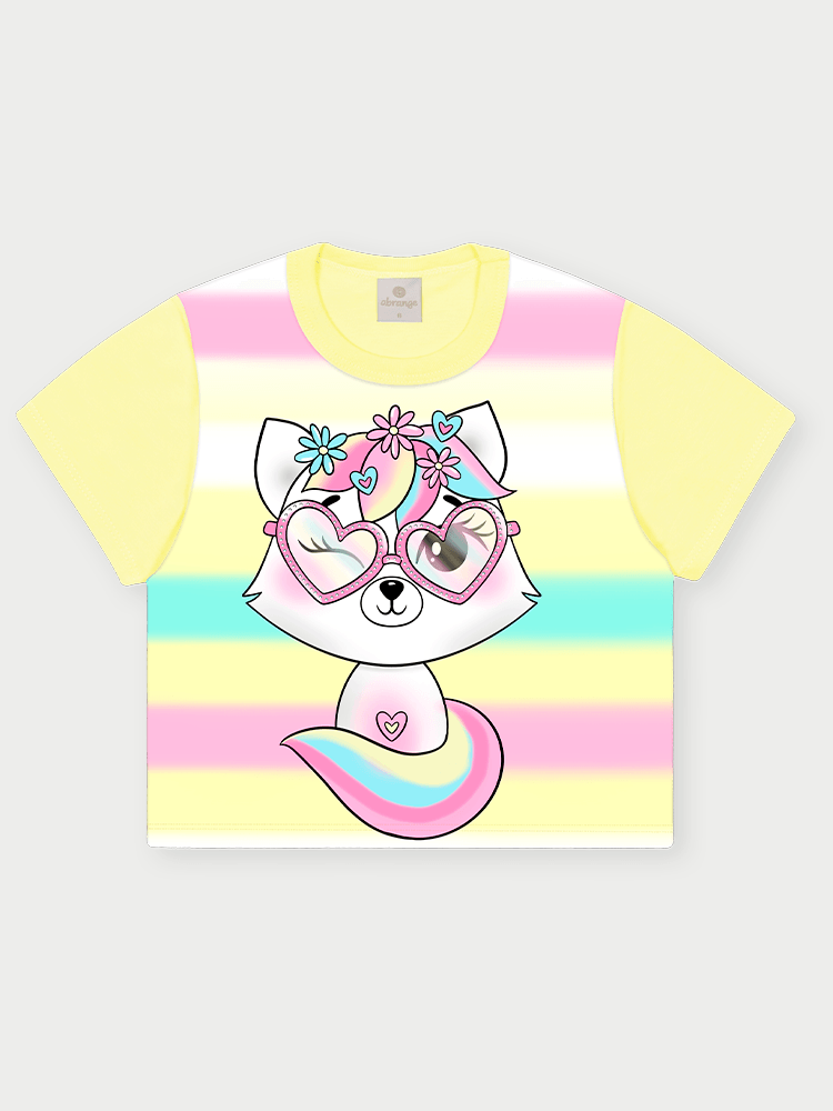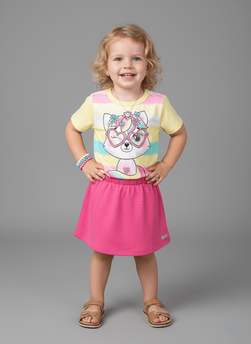 O conjunto infantil feminino é ideal para unir conforto e estilo no dia a dia. A blusa é confeccionada em meia malha 100% algodão, garantindo um toque macio e respirável sobre a pele, com frente sublimada em poliéster com elastano (96% poliéster, 4% elastano), que traz cores vivas, elasticidade suave e caimento perfeito. Já a saia-shorts é produzida em moletinho molinê (77% algodão e 23% poliéster), tecido leve, maleável e com ótimo ajuste ao corpo, oferecendo liberdade de movimento para as crianças brincarem com conforto. O design encanta com estampa exclusiva de raposinha fashion com óculos e flores, combinada a listras coloridas em tons vibrantes, que tornam o look divertido e alegre. A saia-short, além de prática e estilosa, traz um detalhe decorativo delicado e cós elástico que garante ajuste perfeito. Versátil e confortável, o conjunto pode ser usado em diversas ocasiões, como passeios, festinhas, momentos de lazer e no dia a dia. É uma peça que combina estilo moderno com a praticidade que as mães procuram para vestir suas meninas com charme e conforto.