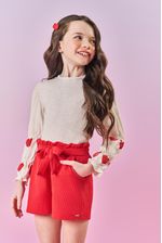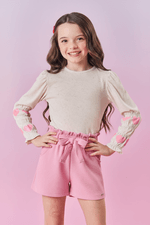 Conjunto encantador e cheio de estilo, ideal para looks fresquinhos e modernos. A blusa é feita em cotton linho, com detalhe de lastex que proporciona um ajuste confortável, além de estampa nas mangas e frufru delicado na bainha dos punhos, trazendo um toque charmoso e único. O short, confeccionado em moletinho waffle, possui elástico no cós estilo clochard, criando um visual sofisticado e confortável. As faixas nas laterais para amarrar em laço e os bolsos frontais acrescentam charme e funcionalidade. A plaquinha decorativa próxima da bainha finaliza o conjunto com um toque de estilo. Perfeito para as pequenas que adoram looks fashion e cheios de conforto. Coleção Inverno 2025. A modelo veste tamanho 06 e possui 1,22cm de altura.