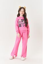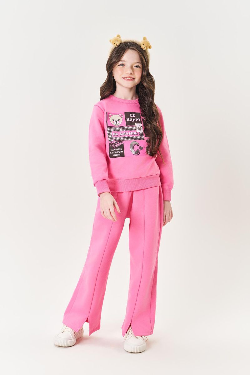Conjunto elegante e confortável, composto por um blusão em moletom felpado com estampa foil frontal, trazendo um toque de brilho e modernidade ao look. Os punhos e a barra em ribana garantem um ajuste perfeito e confortável. A calça wide leg, também em moletom felpado, oferece um visual descomplicado e estiloso, com elástico no cós para maior conforto. O detalhe de recorte frontal e a abertura na bainha frontal adicionam um toque diferenciado e sofisticado à peça. Ideal para criar looks casuais e fashionistas, esse conjunto combina conforto, estilo e um toque único. Coleção Inverno 2025. A modelo veste tamanho 06 e possui 1,22cm de altura.