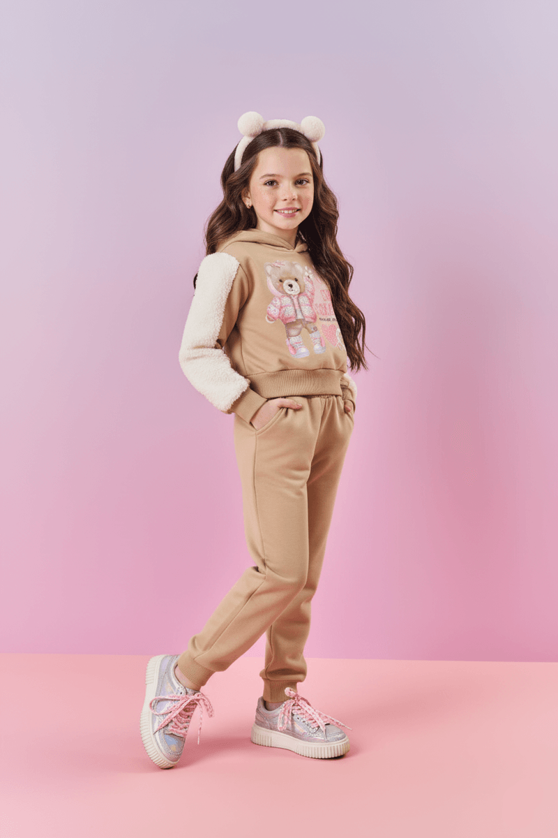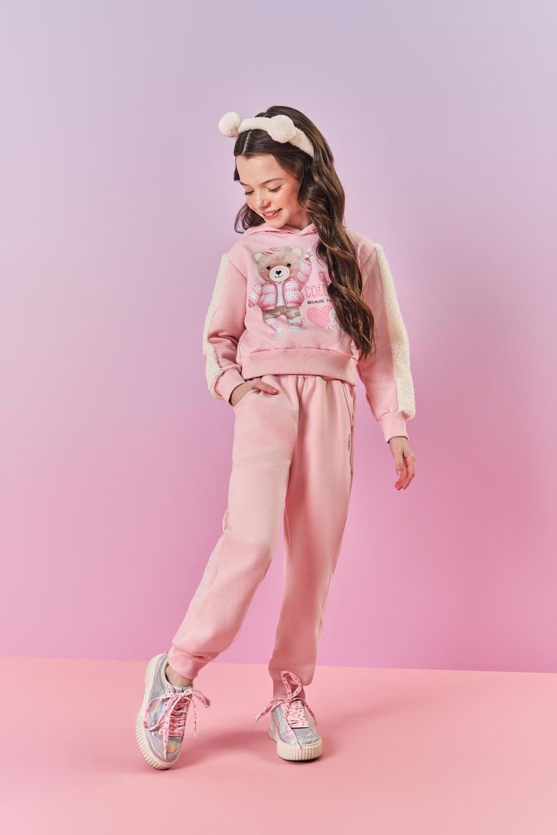 Conjunto composto por blusão e calça jogger, perfeitos para compor looks modernos e confortáveis. O blusão boxy é feito de moletom felpado, com uma estampa frontal brilhante decorada com strass, trazendo um toque de brilho e personalidade. As mangas possuem recorte em pelo carneirinho, adicionando textura e charme ao design. Os punhos e a barra são em ribana, garantindo ajuste perfeito e conforto. A calça jogger acompanha o estilo, sendo também confeccionada em moletom felpado, com elástico no cós para maior praticidade e ajuste. Conta com bolsos frontais e uma etiqueta decorativa abaixo do bolso, além de punhos em ribana, oferecendo um visual descolado e moderno. Ideal para crianças que buscam um look cheio de estilo e aconchego! Coleção Inverno 2025. A modelo veste tamanho 06 e possui 1,22cm de altura.