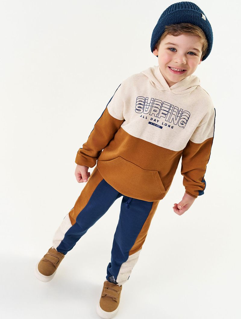 Conjunto masculino de blusão em moletom felpado com recorte nas mangas e estampa no peito bolso canguru e calça em moletom felpado com elástico e cadarço decorativo no cós recortes nas laterais e etiqueta decorativa próximo do punho. Inverno 2024. Modelo veste tamanho 4 e possui 1 06 cm de altura.