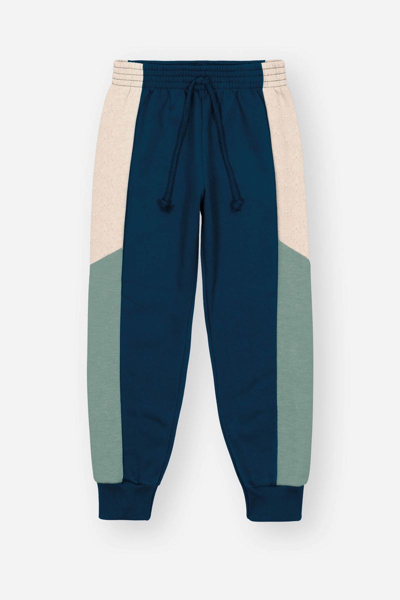 A calça em moletom felpado acompanha o blusão com um ajuste confortável, graças ao elástico na cintura, proporcionando liberdade de movimento. O cadarço na cintura com ponta em nó oferece um toque descontraído e personalizado, enquanto o recorte nas laterais das pernas adiciona um detalhe moderno ao visual. As barras com punho em ribana garantem um caimento perfeito e um acabamento refinado. Os recortes contrastantes nas laterais e na parte superior da calça complementam o look, criando harmonia com o blusão.