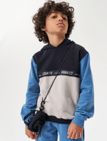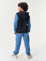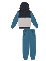Conjunto infantil masculino de blusão em moletom felpado com elástico estampado no peito e calça em moletom felpado com elástico no cós e bolsos frontais com abertura em zíper. Inverno 2024. Modelo veste tamanho 8 e possui 1,31 cm de altura.