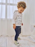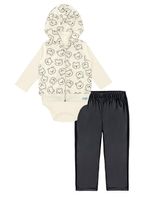 Conjunto bebê feminino de body em cotton com gola transpassada para melhor vestir e abertura em botões calça legging em P.U. com elástico no cós e frente com tecido imitando courino colete em pelo fleece com orelhas 3D no capuz abertura frontal em zíper etiqueta decorativa na barra e estampa total. Alto Verão 24. Modelo veste tamanho GG e possui 83 cm de altura.