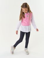 Conjunto feminino de camisa em tricoline com abertura em botões gola e elástico nos punhos calça legging em molecotton denim com elástico no cós e colete em malha vino tint com etiqueta decorativa no peito. Inverno 2024. Modelo veste tamanho 8 e possui 1 35 de altura.