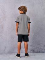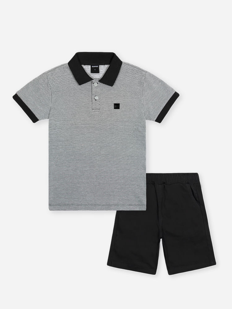 O design do conjunto combina a polo em piquet texturizado com detalhes contrastantes e a bermuda lisa, criando um visual versátil que pode ser usado tanto em ocasiões casuais quanto em eventos mais arrumados.