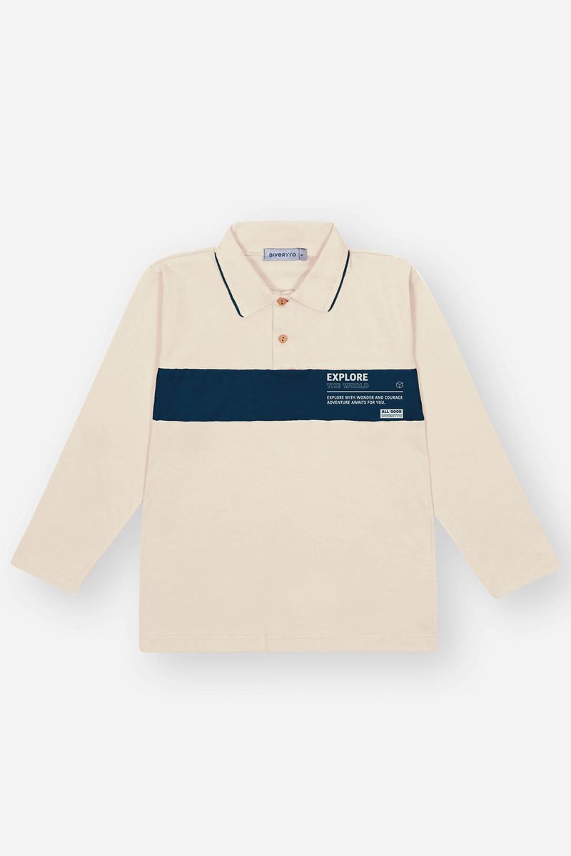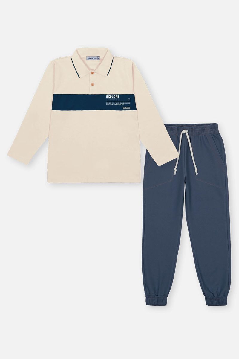 Esse conjunto une sofisticação e conforto para os meninos que gostam de se vestir com estilo. A camisa polo de manga longa, confeccionada em meia malha, traz um toque clássico com sua gola em meia malha e friso filete, além do peitilho colocado com botão de madeira, que acrescenta um charme rústico e elegante. O recorte frontal com estampa adiciona um detalhe moderno e autêntico à peça. Complementando o look, a calça em molecotton denim oferece praticidade e liberdade de movimento, com elástico na cintura para um ajuste confortável, bolsos funcionais e cadarço com nó nas pontas. A barra com punho em elástico finaliza o visual com um toque despojado e moderno, perfeito para qualquer ocasião.