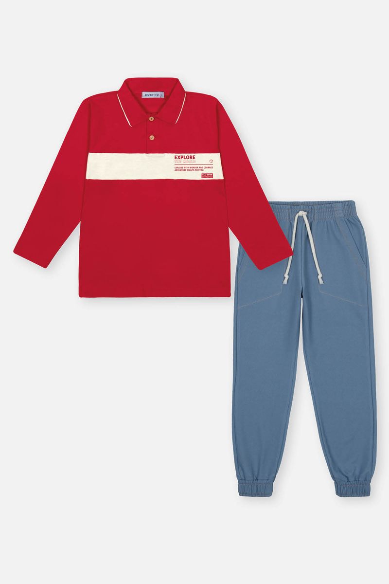 Esse conjunto une sofisticação e conforto para os meninos que gostam de se vestir com estilo. A camisa polo de manga longa, confeccionada em meia malha, traz um toque clássico com sua gola em meia malha e friso filete, além do peitilho colocado com botão de madeira, que acrescenta um charme rústico e elegante. O recorte frontal com estampa adiciona um detalhe moderno e autêntico à peça. Complementando o look, a calça em molecotton denim oferece praticidade e liberdade de movimento, com elástico na cintura para um ajuste confortável, bolsos funcionais e cadarço com nó nas pontas. A barra com punho em elástico finaliza o visual com um toque despojado e moderno, perfeito para qualquer ocasião.