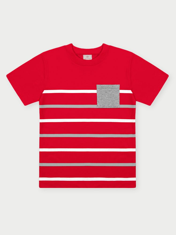 A camiseta é confeccionada em meia malha de toque leve, macio e confortável, ideal para climas mais quentes e para o uso prolongado. O decote redondo com aplicação de friso em ribana garante um ajuste suave ao pescoço, com mais resistência ao uso frequente. A peça se destaca com a estampa de listras e a aplicação de bolso em moletom, que traz textura e um toque diferenciado, acrescentando estilo à composição.