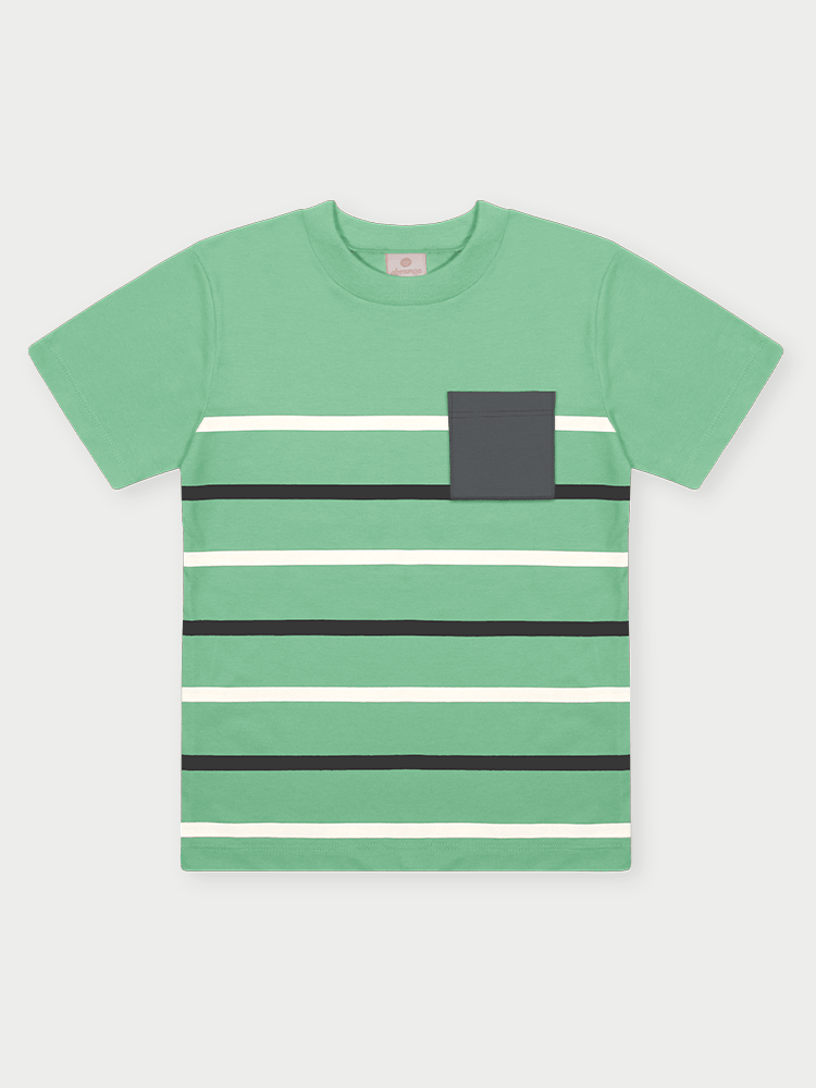 A camiseta é confeccionada em meia malha de toque leve, macio e confortável, ideal para climas mais quentes e para o uso prolongado. O decote redondo com aplicação de friso em ribana garante um ajuste suave ao pescoço, com mais resistência ao uso frequente. A peça se destaca com a estampa de listras e a aplicação de bolso em moletom, que traz textura e um toque diferenciado, acrescentando estilo à composição.