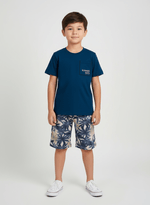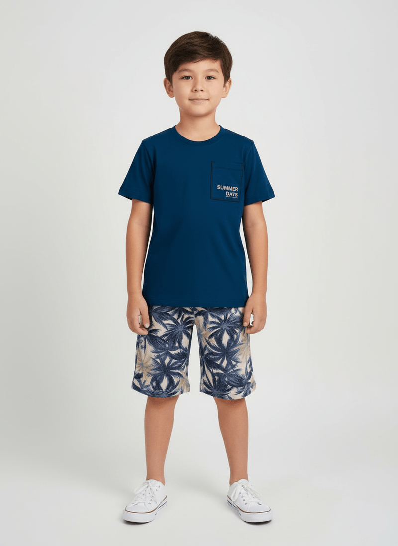 O conjunto para menino, disponível nos tamanhos 04 ao 14, é a combinação perfeita de conforto e estilo para os dias mais quentes. Composto por camiseta e bermuda, o look está disponível em três cores modernas e versáteis — azul marinho, natural e verde flour.
