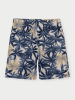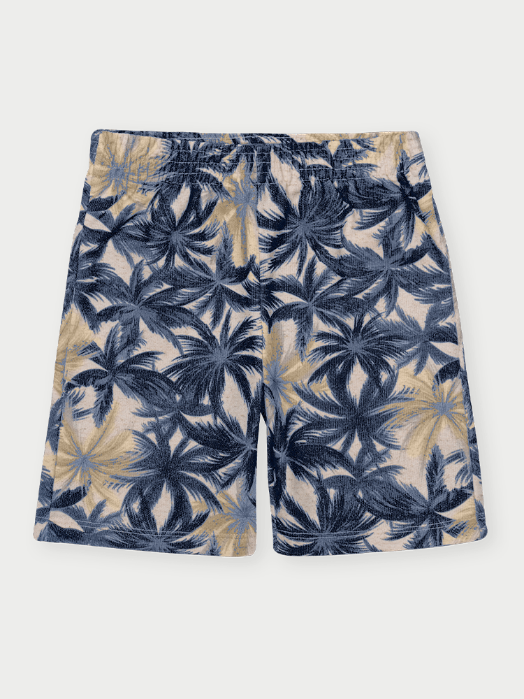 Já a bermuda é produzida em moletom linho, um tecido encorpado com textura suave ao toque e aparência levemente rústica, que garante conforto e estilo ao mesmo tempo. O elástico na cintura proporciona um ajuste seguro e prático, enquanto a estampa de folhas de palmas por toda a peça reforça a proposta tropical e descontraída do conjunto.