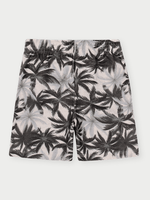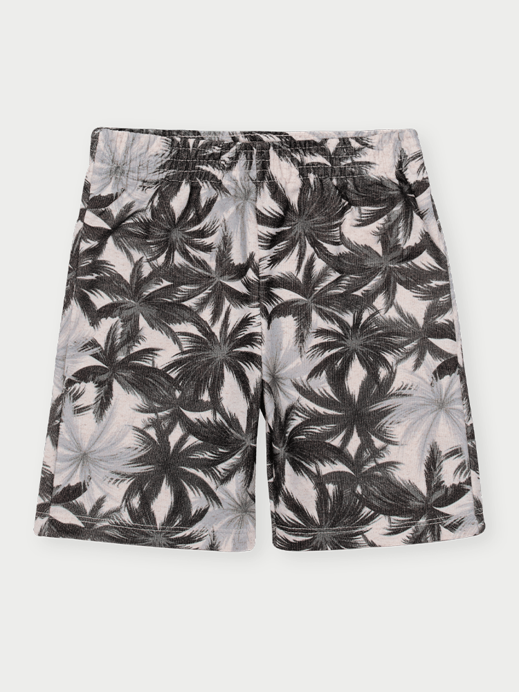 Já a bermuda é produzida em moletom linho, um tecido encorpado com textura suave ao toque e aparência levemente rústica, que garante conforto e estilo ao mesmo tempo. O elástico na cintura proporciona um ajuste seguro e prático, enquanto a estampa de folhas de palmas por toda a peça reforça a proposta tropical e descontraída do conjunto.