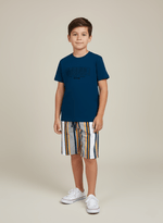 O conjunto para menino, disponível nos tamanhos 04 ao 14, é uma opção leve, estilosa e confortável para os dias mais quentes. Composto por camiseta e bermuda, ele está disponível em três cores versáteis e cheias de personalidade: azul marinho, verde bandeira e branco.