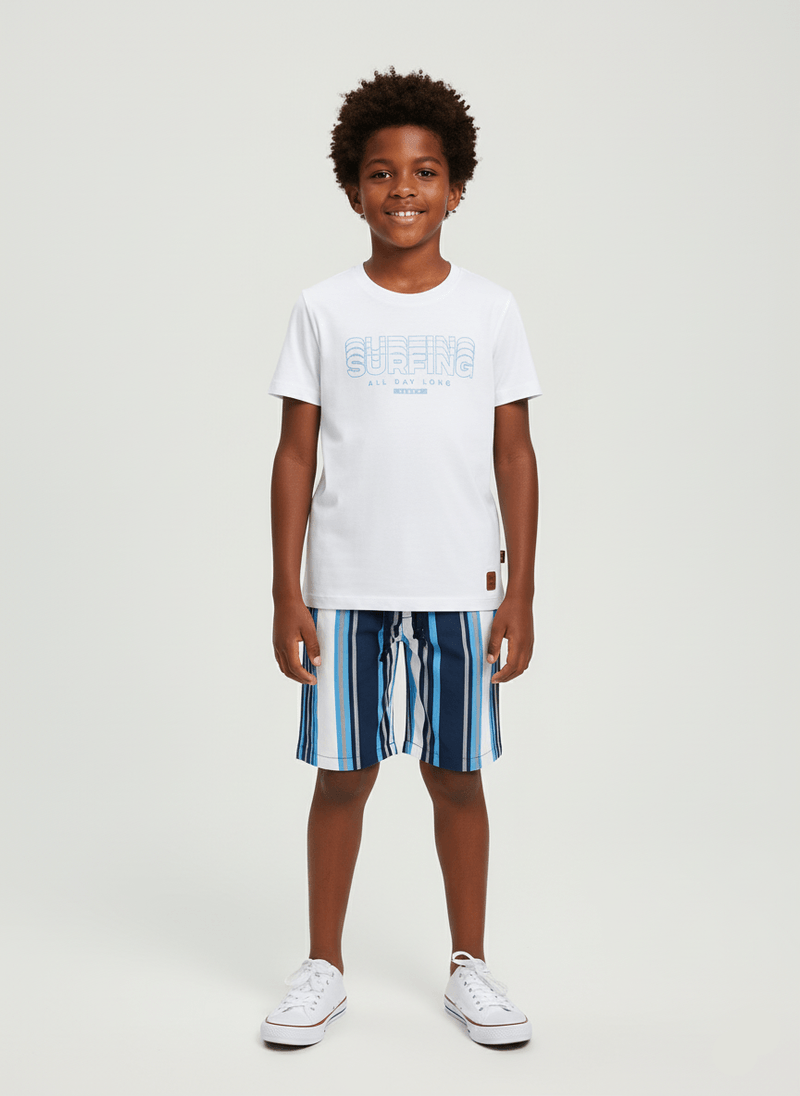 O conjunto para menino, disponível nos tamanhos 04 ao 14, é uma opção leve, estilosa e confortável para os dias mais quentes. Composto por camiseta e bermuda, ele está disponível em três cores versáteis e cheias de personalidade: azul marinho, verde bandeira e branco.