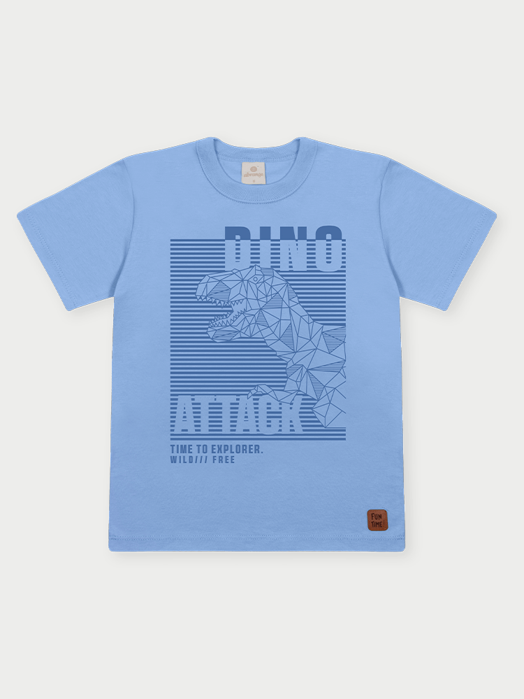 A camiseta é confeccionada em meia malha, um tecido de toque leve, macio e suave sobre a pele, ideal para acompanhar os meninos nas atividades diárias com frescor e conforto. O decote redondo com friso em ribana proporciona um caimento seguro e acabamento reforçado, enquanto a estampa frontal de dinossauro T-Rex adiciona um toque divertido e aventureiro ao look. A etiqueta decorativa próxima à barra completa o visual com charme.
