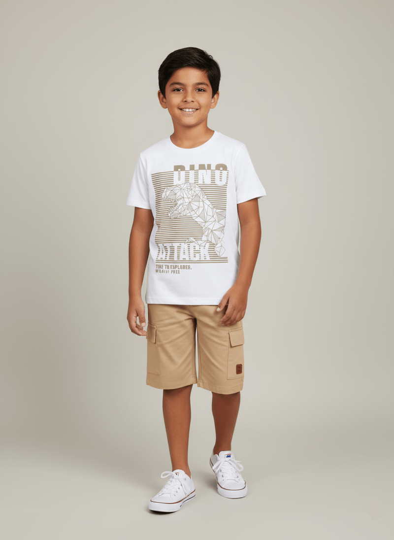 A camiseta é confeccionada em meia malha, um tecido de toque leve, macio e suave sobre a pele, ideal para acompanhar os meninos nas atividades diárias com frescor e conforto. O decote redondo com friso em ribana proporciona um caimento seguro e acabamento reforçado, enquanto a estampa frontal de dinossauro T-Rex adiciona um toque divertido e aventureiro ao look. A etiqueta decorativa próxima à barra completa o visual com charme.