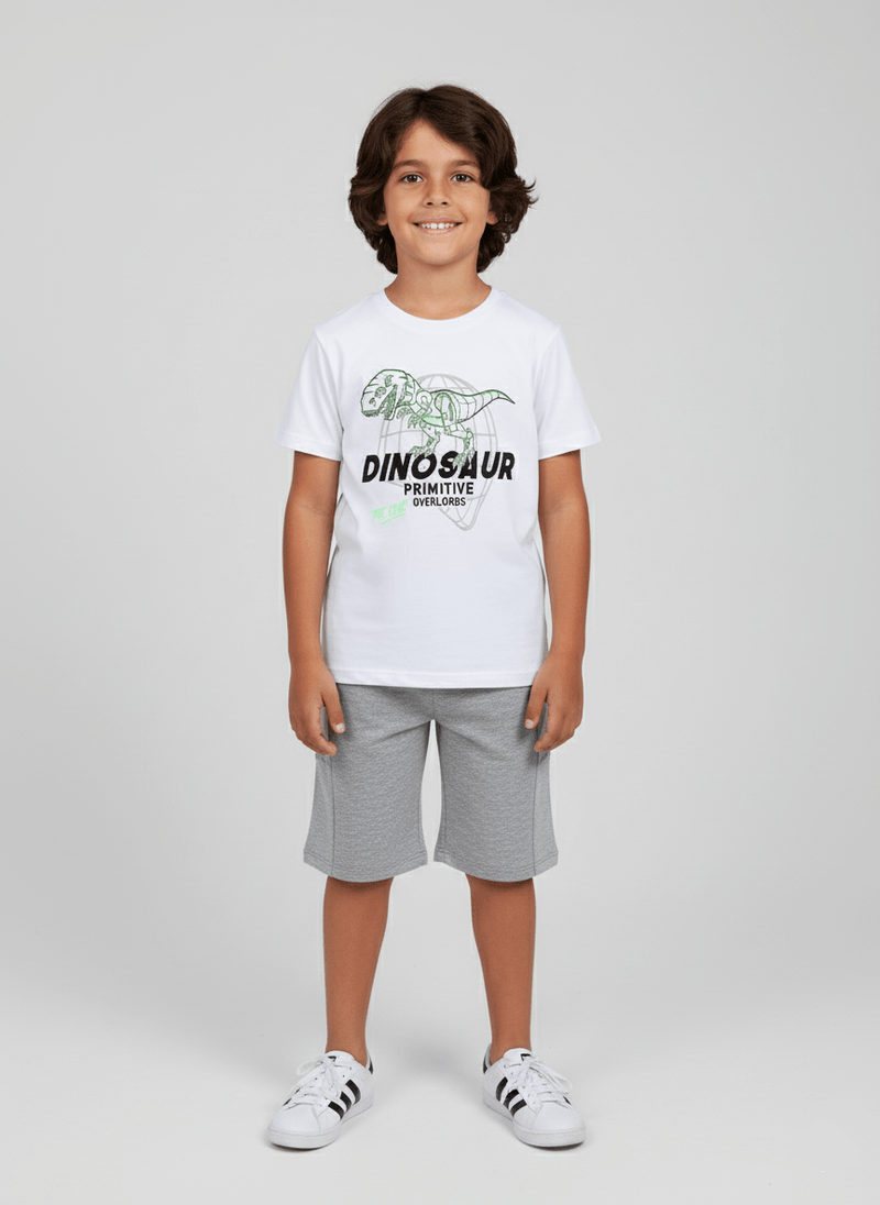 A camiseta é confeccionada em meia malha, um tecido leve, fresco e de toque extremamente macio, que proporciona conforto térmico e liberdade de movimentos. O decote redondo com aplicação de friso em ribana oferece um caimento confortável e reforçado, enquanto a estampa frontal de T-Rex com lettering traz uma pegada divertida e aventureira que os meninos adoram.