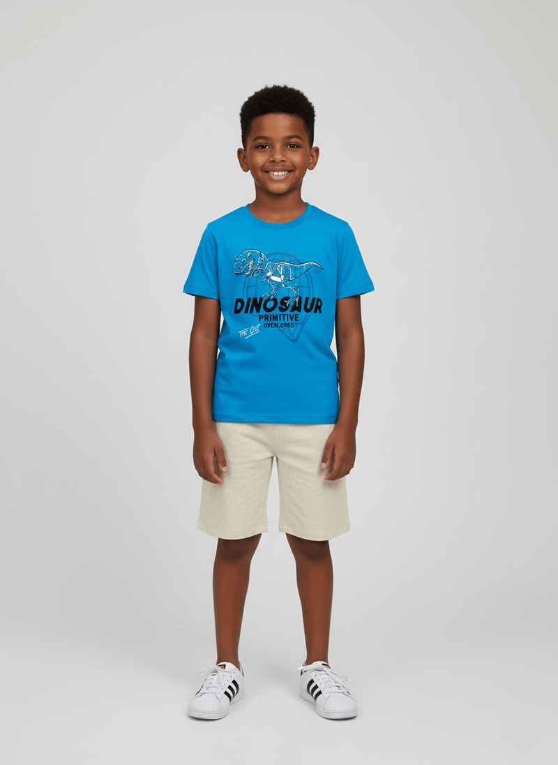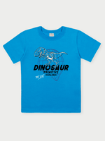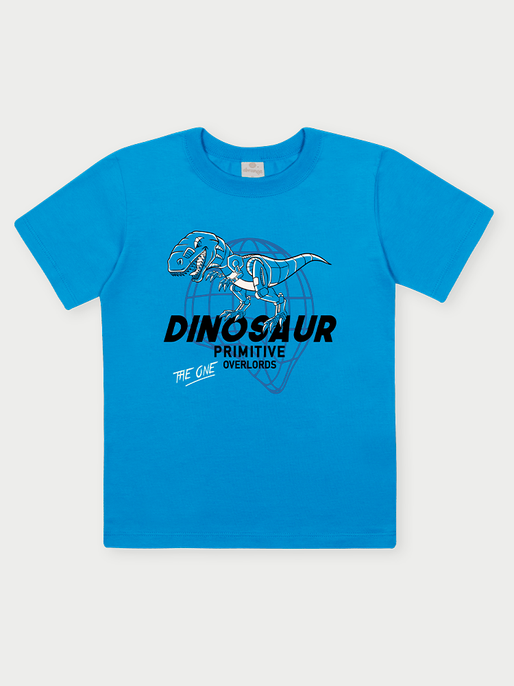 A camiseta é confeccionada em meia malha, um tecido leve, fresco e de toque extremamente macio, que proporciona conforto térmico e liberdade de movimentos. O decote redondo com aplicação de friso em ribana oferece um caimento confortável e reforçado, enquanto a estampa frontal de T-Rex com lettering traz uma pegada divertida e aventureira que os meninos adoram.