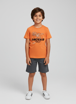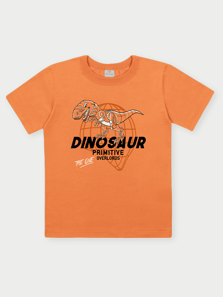A camiseta é confeccionada em meia malha, um tecido leve, fresco e de toque extremamente macio, que proporciona conforto térmico e liberdade de movimentos. O decote redondo com aplicação de friso em ribana oferece um caimento confortável e reforçado, enquanto a estampa frontal de T-Rex com lettering traz uma pegada divertida e aventureira que os meninos adoram.