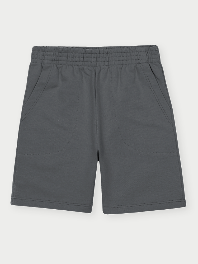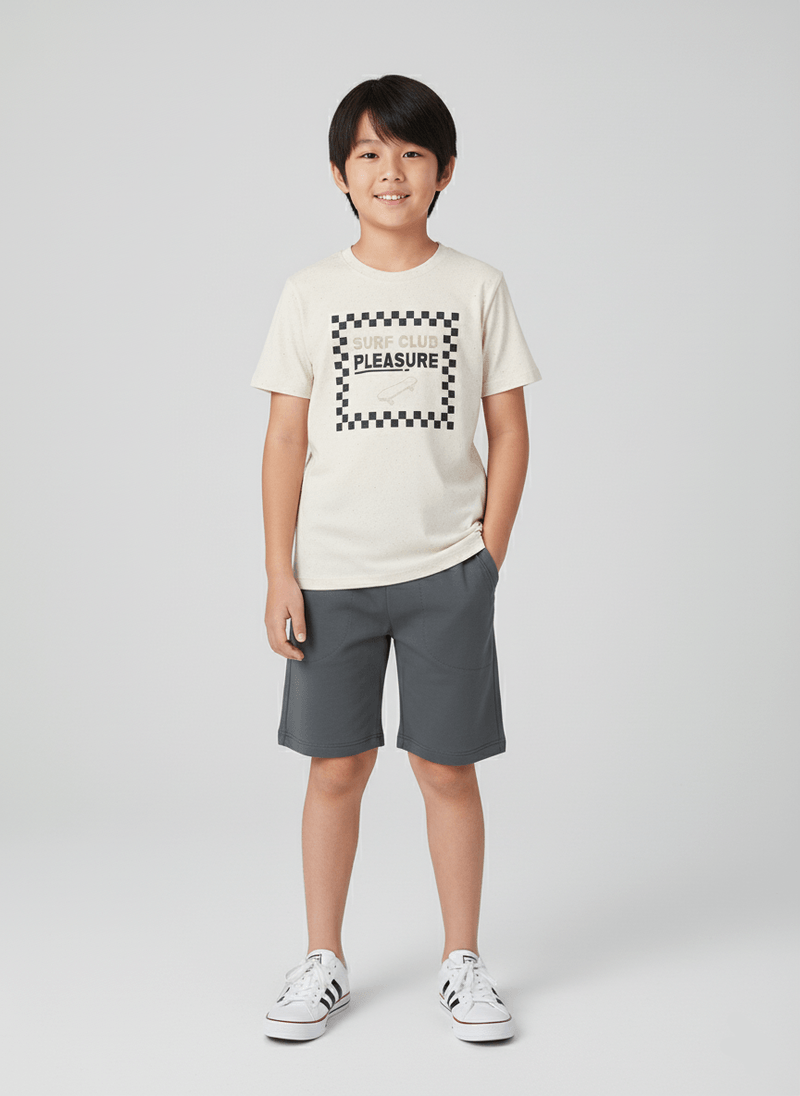 A bermuda, feita em moletom, apresenta um toque mais encorpado, porém igualmente confortável, ideal para acompanhar o ritmo das brincadeiras com segurança e flexibilidade. O elástico na cintura proporciona um ajuste prático e firme, e os bolsos chapados frontais funcionais completam o conjunto com um toque de utilidade e estilo.