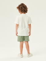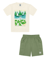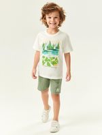 Conjunto masculino de camiseta em meia malha com estampa frontal e bermuda em moletom canelado com elástico cós, recortes laterais com bolsos e etiqueta decorativa próximo da bainha. Alto Verão 24. Modelo veste tamanho 4 e possui 1,10 de altura.