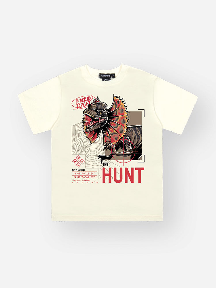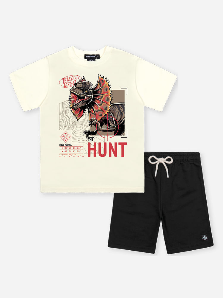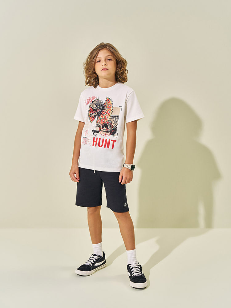 A camiseta é feita em meia malha 100% algodão, com decote redondo e friso em ribana, proporcionando frescor e liberdade de movimentos. A estampa frontal maximalista destaca o temido Dilofossauro, com seus dados geográficos e científicos em destaque, despertando a curiosidade e o fascínio das crianças por esse dinossauro famoso por sua agilidade e ataque surpresa.